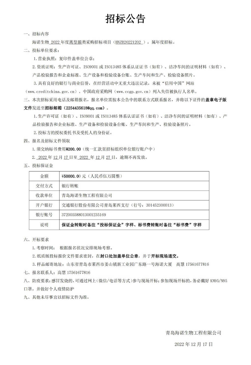 2022.12.18海諾生物2022年度離型膜類采購招標(biāo)項目現(xiàn)已正式開始,屆時我們將秉承公正、公平、公開、透明的招標(biāo)原則,期待優(yōu)秀供應(yīng)商的廣泛參與。具體招標(biāo)細(xì)節(jié)如下: