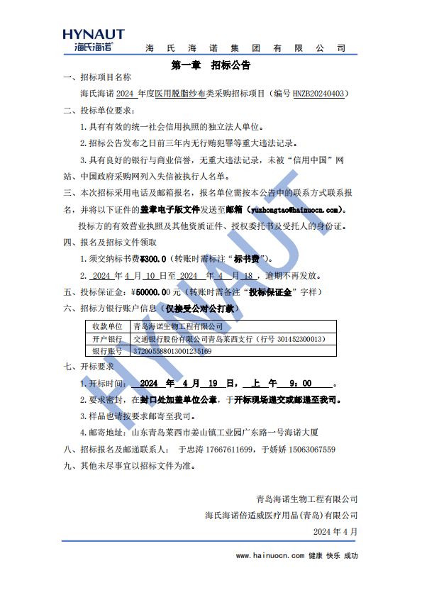 海氏海諾醫(yī)用脫脂紗布類采購項(xiàng)目招標(biāo)公告